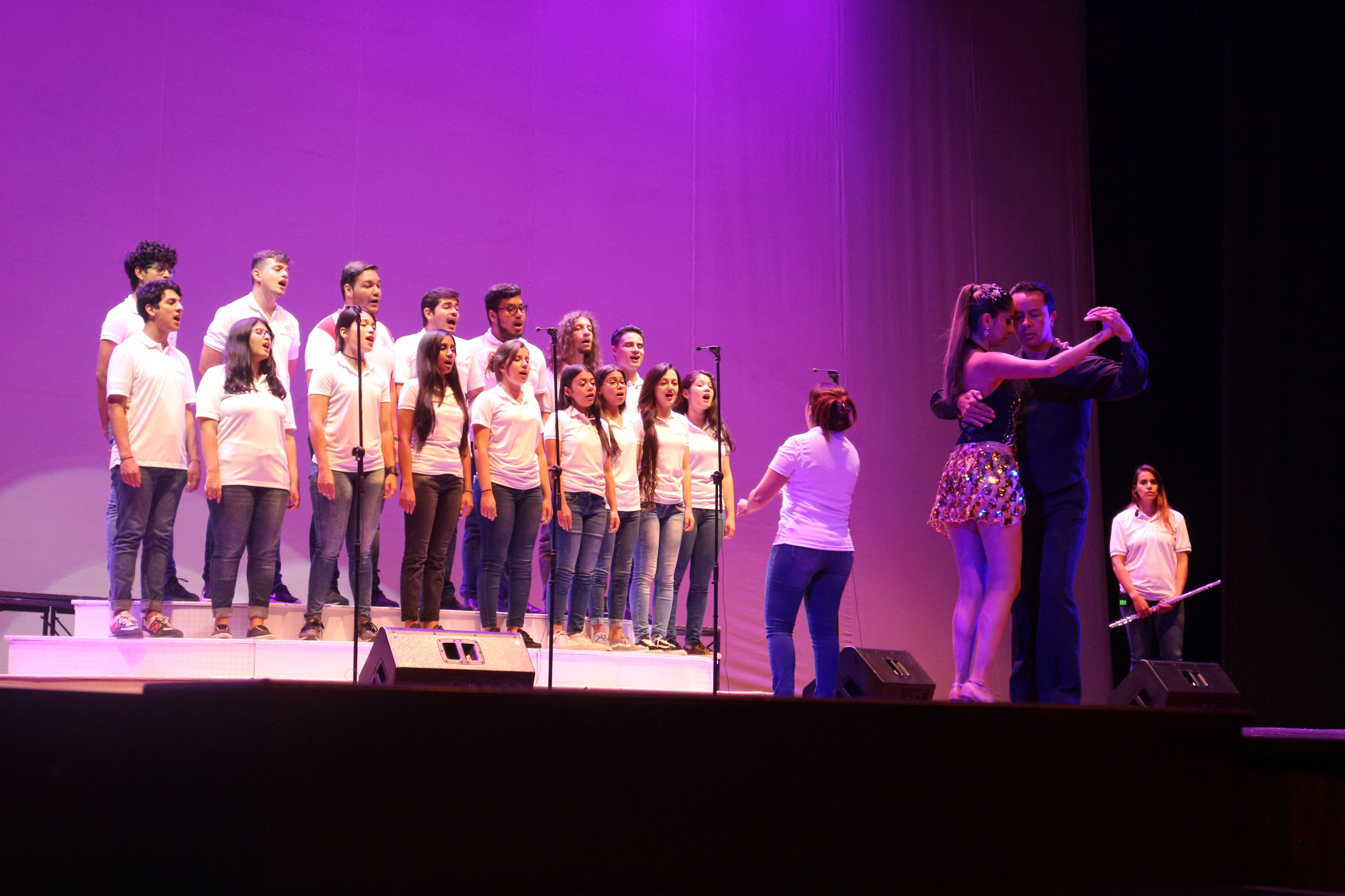 El Grupo Fomento Artístico y Cultural realizó un ensamble de música, teatro y baile para darle la bienvenida a los estudiantes nuevos de posgrados pertenecientes al período lectivo 2019-1. En la foto se puede apreciar el Coro de Cámara de la UdeMedellín y los profesores de bailes de salón.