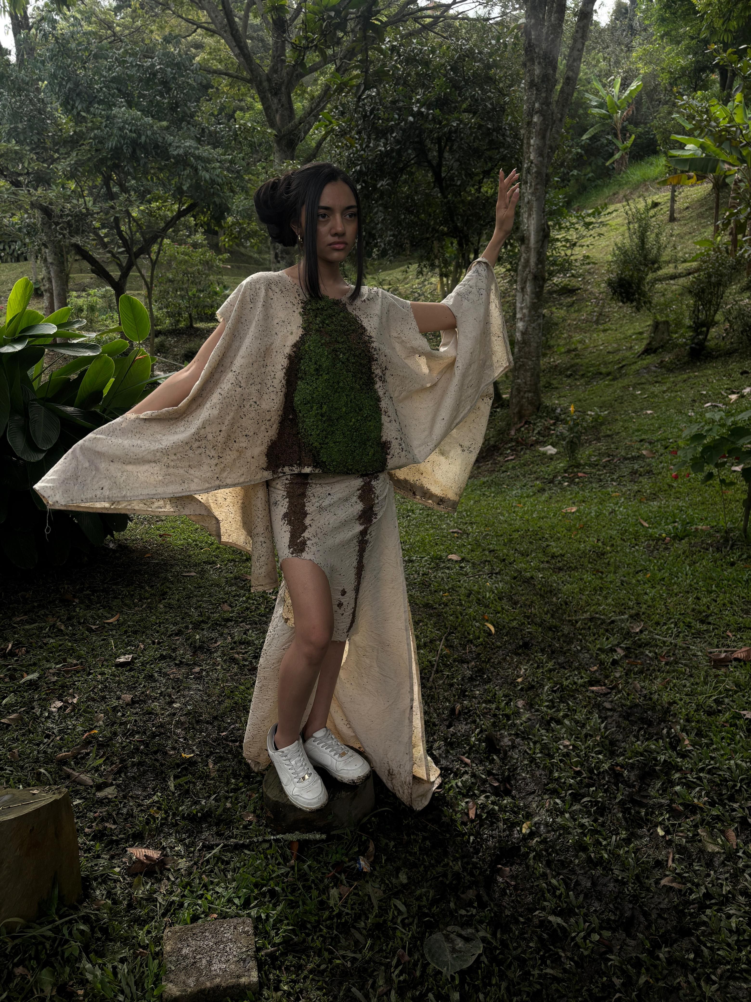 This life-centered design tells the story of a body that is not dressed, but cultivated. Inspired by the silhouettes of fitted dresses, each fold is a pause, each texture, a possibility. The germination of chia seeds is what makes it unique, turning the dress into an object of care that alludes to possible futures where the body intertwines with nature. In the invisible, the essential grows—suggesting that what is alive is suggested, not imposed.